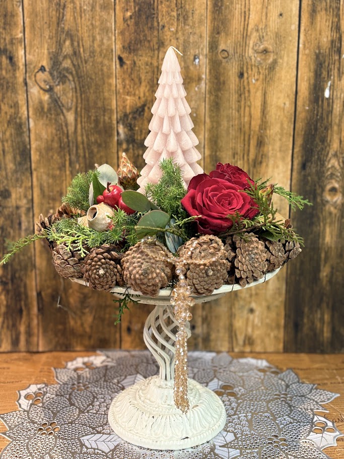 松かさを使ったクリスマスアレンジ。キャンドルはツリー型。