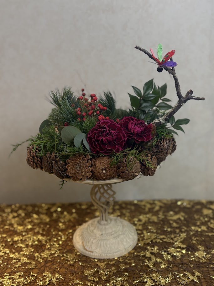 松野枝、梅の古木、南天の実。色はどちらもグリーン+赤なんで違和感なしです。